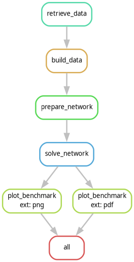 As you can see, the plot_benchmark rule will be called twice with two different filename extensions. For this, we are taking advantage of the concept of wildcards (ext). Snakemake will automatically resolve the wildcards using the dependency graph. In this case, the all rule takes as input both a png and a pdf figure which propagates back throughout the workflow.